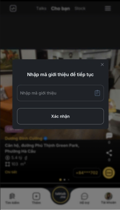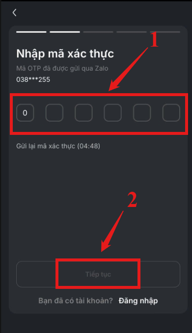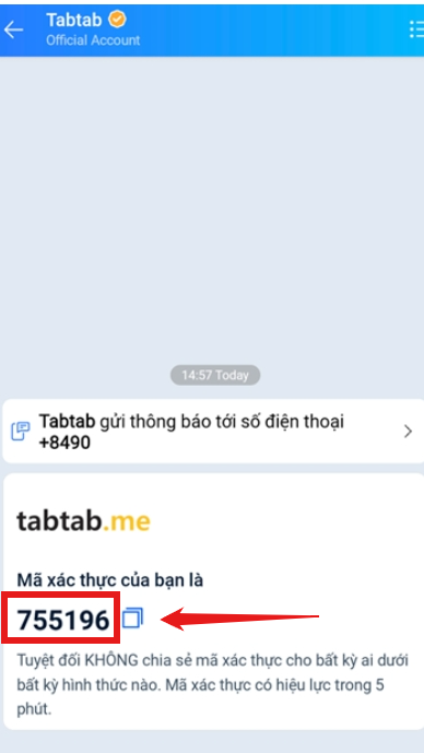 Bước 3: Nhập mã được tabtab.me gửi qua Zalo theo số điện thoại đã đăng ký