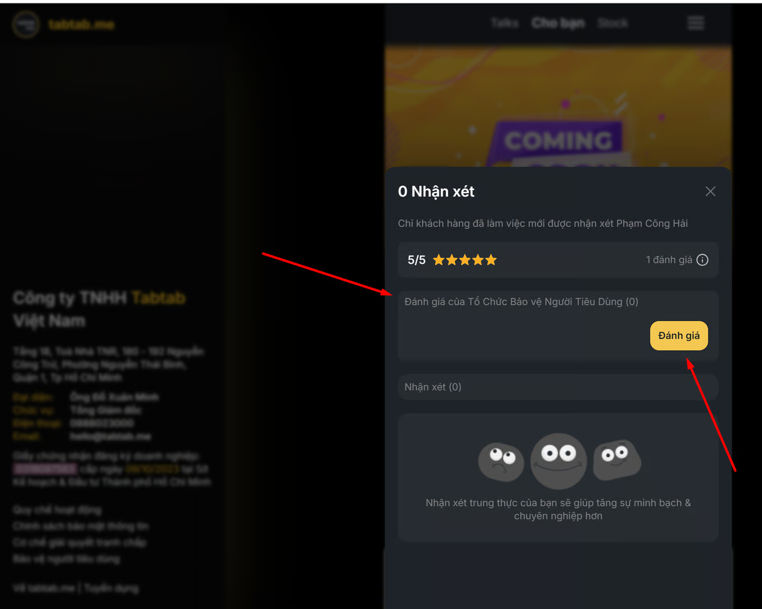Tabtab.me có chức năng đánh giá sao tín nhiệm cá nhân, và phản ánh công khai trên nên tảng, điều đó nhằm giúp cho người quan tâm/người mua/người thuê đánh giá đúng, đủ, chính xác người bán/người cho thuê trên nền tảng tabtab.me
